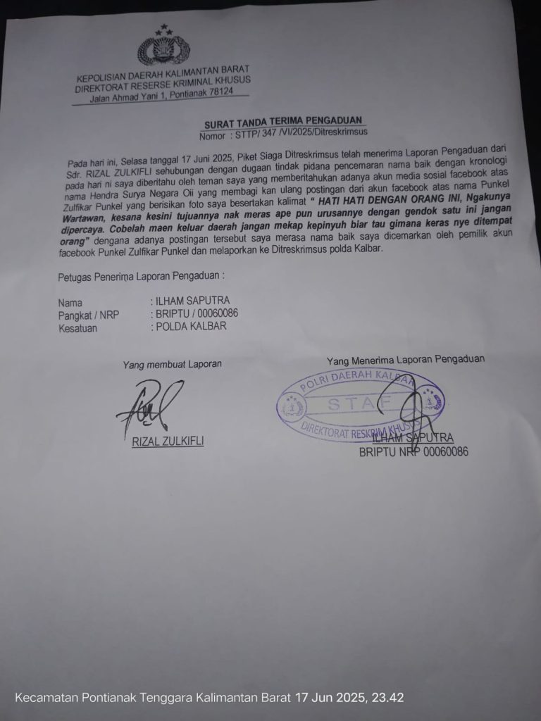 Ia mengatakan laporan tersebut telah di registrasi dengan Laporan Polisi Nomor: STTP/347/VI/2025/Ditreskrimsus/Polda Kalimantan Barat pada tanggal Selasa, 17 Juni 2025.